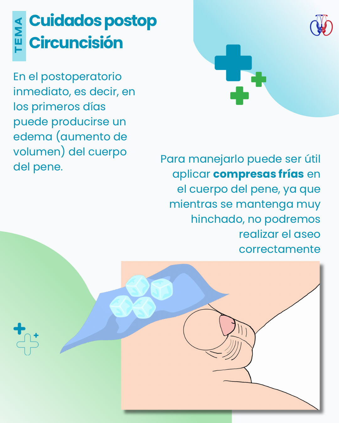 • Aplicar compresas frías sobre el cuerpo del pene 2–3 veces al día por unos minutos (envolviendo hielo en un paño limpio, nunca directo sobre la piel).